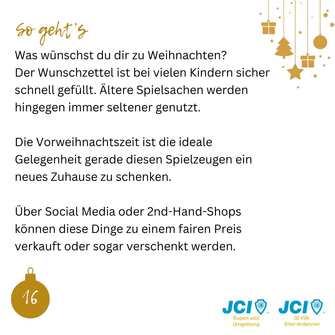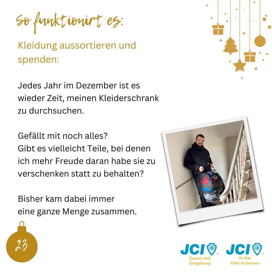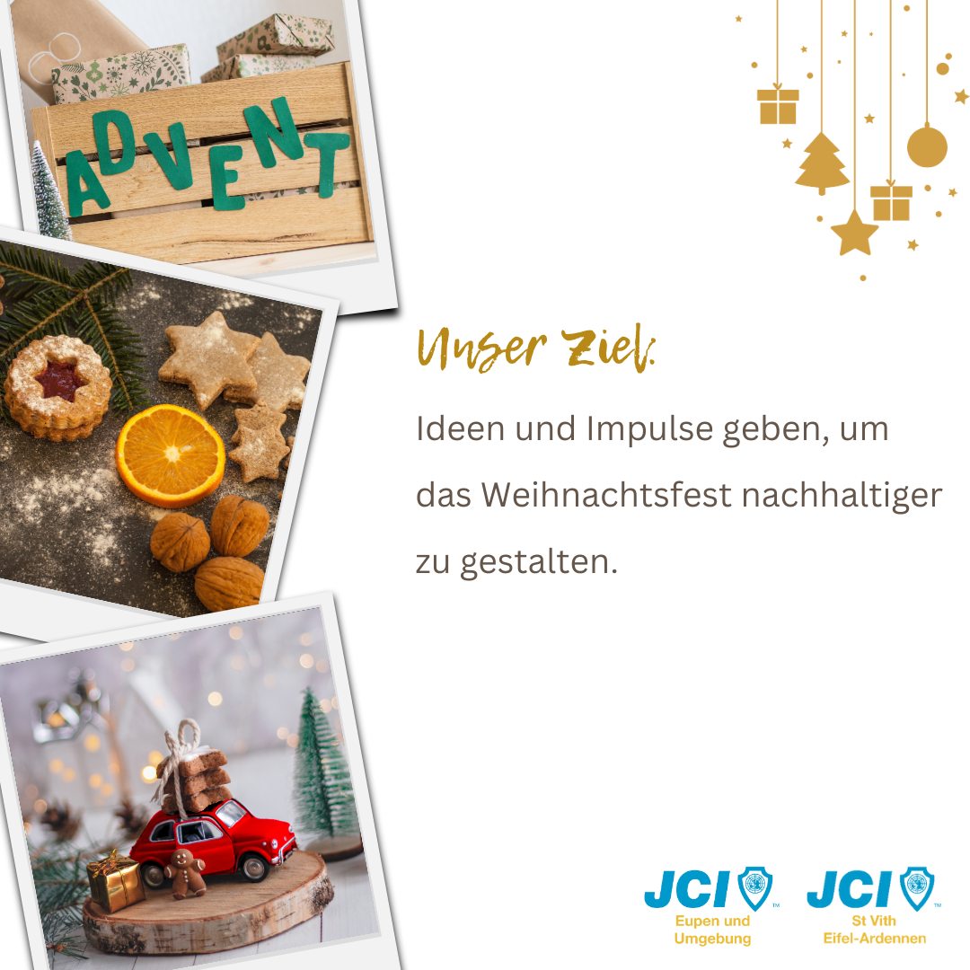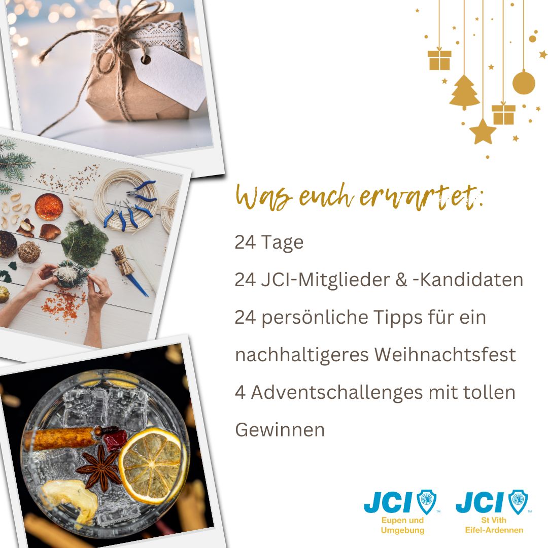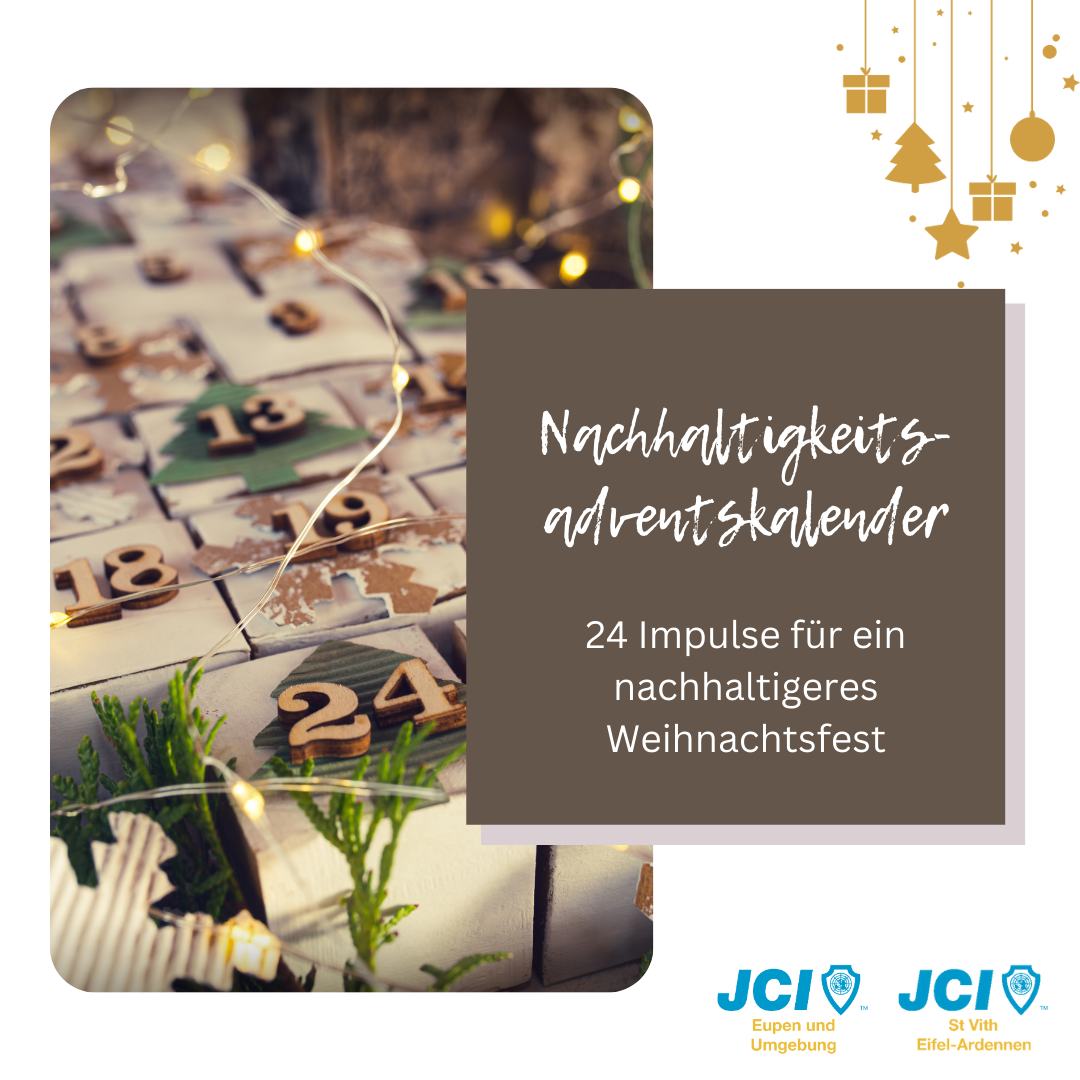 Der nachhaltige Adventskalender war ein gemeinschaftliches Projekt mit der JCI St. Vith Eifel-Ardennen, das wir im Dezember 2023 durchgeführt haben, um den Fokus auf Nachhaltigkeit und umweltbewussten Konsum zu lenken. Ziel war es, die Gemeinschaft zu inspirieren, Weihnachten nachhaltiger zu denken und zu gestalten.